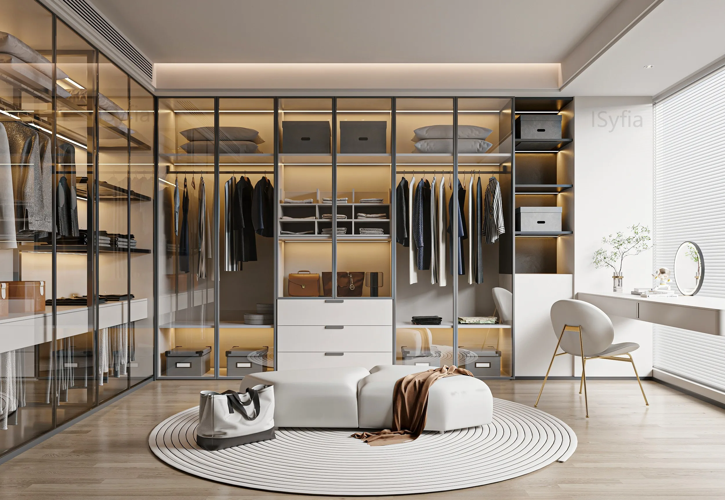 Luxury Minimalist Modern Walk-In Closet Customized Glass Wardrobe Furniture for Villa Apartments 3D Interior Design with Shelves
