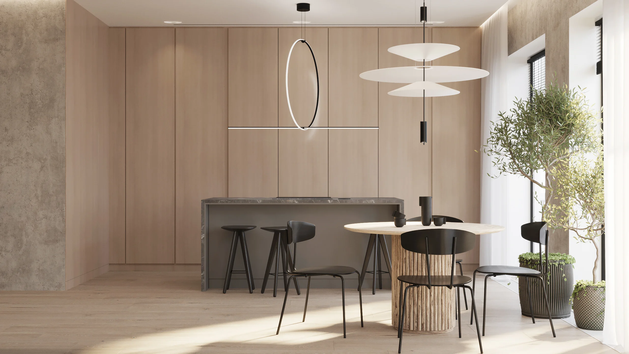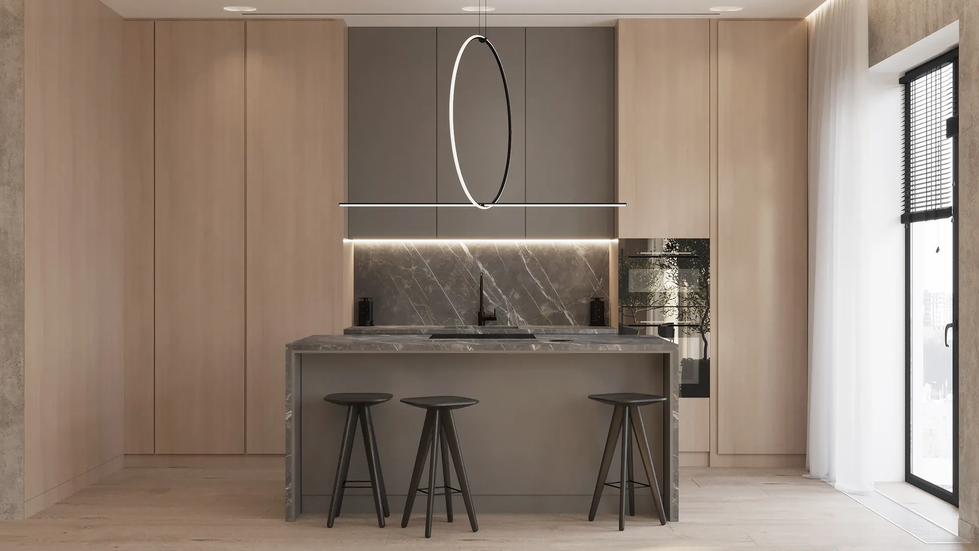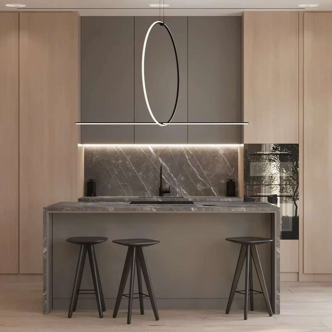 Modern Minimalism Villa Kitchen Cabinet Apartment Modular Cabinets Natural Wood Tone Kitchen Cabinet Electric Lifting Range Hood